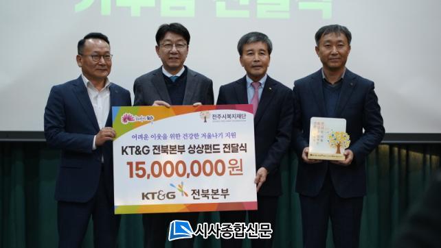 ¾Õ¼ KT&G ÀüºÏº»ºÎ´Â Ãß¿î °Ü¿ïÀ» ¾ÕµÐ ÀüÁÖÁö¿ª Ãë¾à°èÃþÀ» µ½±â À§ÇØ ÀüÁֽú¹ÁöÀç´Ü ÀüÁÖ»ç¶÷¿¡ ±âºÎ±Ý 1500¸¸ ¿øÀ» Àü´ÞÇÑ ¹Ù ÀÖ´Ù. À̹ø ÈÄ¿ø±ÝÀº KT&G ÀÓÁ÷¿øµéÀÇ ÀÚ¹ßÀûÀÎ ±âºÎ¸¦ ÅëÇØ Á¶¼ºµÈ ¡®»ó»óÆÝµå¡¯¿¡¼ ¸¶·ÃµÆ´Ù.