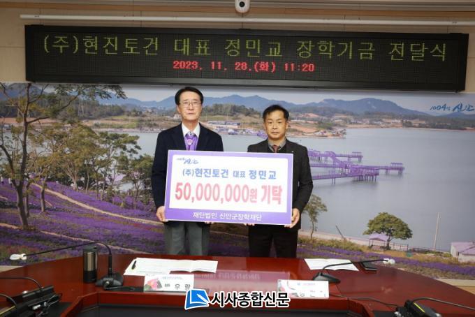 [½Ã»çÁ¾ÇսŹ® = ¿À½ÂÅà ±âÀÚ] (ÁÖ)ÇöÁøÅä°Ç Á¤¹Î±³ ´ëÇ¥´Â Áö³ 11¿ù 28ÀÏ ½Å¾È±ºÃ»À» ¹æ¹®ÇÏ¿© °æÁ¦ÀûÀ¸·Î Èûµç ÇлýµéÀ» À§ÇØ ½á ´Þ¶ó¸ç ½Å¾È±ºÀåÇÐÀç´Ü(ÀÌ»çÀå ¹Ú¿ì·®)¿¡ 5õ¸¸ ¿ø ±âŹÀ» ¾àÁ¤Çß´Ù.