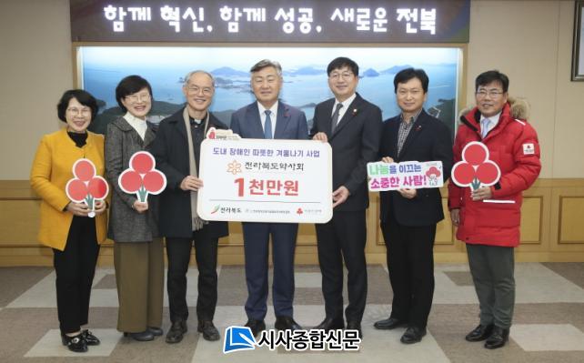 [½Ã»çÁ¾ÇսŹ® = ±è¿¬Èñ ±âÀÚ] Àü¶óºÏµµ´Â 11ÀÏ ÀüºÏµµÃ» ȸÀǽǿ¡¼ ±è°ü¿µ µµÁö»ç¿Í ¹é°æÇÑ Àü¶óºÏµµ ¾à»çȸÀå, À¯º´¼³ ÀüºÏ»çȸº¹Áö°øµ¿¸ð±Ýȸ »ç¹«Ã³ÀåÀÌ ÀÚ¸®¸¦ ÇÔ²²ÇÏ°í µµ³» ¾î·Á¿î ÀÌ¿ôÀ» À§ÇØ ½á´Þ¶ó¸ç ¾à»çȸ°¡ ¸¶·ÃÇÑ Èñ¸Á³ª´® ¼º±Ý 1õ¸¸¿øÀ» ÀüºÏ»çȸº¹Áö°øµ¿¸ð±Ýȸ¿¡ ±âÅ¹ÇØ ¿Ô´Ù°í ¹àÇû´Ù.