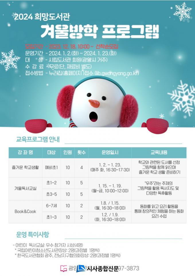 | ±¤¾çÈñ¸Áµµ¼°ü, Ã¥°ú ÇÔ²² ¾ËÂù °Ü¿ï¹æÇÐ ÇÁ·Î±×·¥ ¿î¿µ °Ü¿ïµ¶¼±³½Ç, Áñ°Å¿î Çб³»ýȰ µî... 18ÀϺÎÅÍ ¼±Âø¼ø ¸ðÁý |