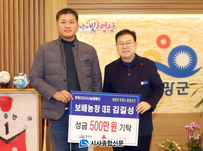 [½Ã»çÁ¾ÇսŹ® = ¿À½ÂÅà ±âÀÚ] Áö³ 20ÀÏ, ¿µ±¤À¾ ¿Í·æ·Î¿¡ ÀÖ´Â º¸¹è³óÀå ±è±æ¼º ´ëÇ¥°¡ ±º º¹Áö »ç°¢Áö´ë¿Í Áö¿ª °æÁ¦ Ȱ¼ºÈ¸¦ À§ÇØ ¿µ±¤°÷°£¿¡ ¼º±Ý 500¸¸ ¿øÀ» Àü´ÞÇÏ¸é¼ Èñ¸Á2024 ³ª´®Ä·ÆäÀο¡ ¿ÂÁ¤ÀÇ ¼Õ±æÀ» ´õÇß´Ù.
