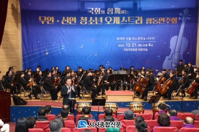 À̳¯ ¹«¾È±º ²ÞÀÇ ¿ÀÄɽºÆ®¶ó´Ü°ú ½Å¾È±º 1004 û¼Ò³â ¿ÀÄɽºÆ®¶ó´Ü 150¿© ¸íÀÇ ´Ü¿øÀº ±¹È¸ÀÇ¿øÈ¸°ü ´ëȸÀǽǿ¡¼ ¡®È·ÁÇÑ ¼±À² À§·Î Èñ¸ÁÀ» ³ª´©´Ù¡¯¶ó´Â ÁÖÁ¦·Î °¢ÀÚÀÇ Àç´ÉÀ» »Ë³»¸ç 12°îÀÇ ¾Æ¸§´Ù¿î °îÀ» ¿¬ÁÖÇß´Ù.