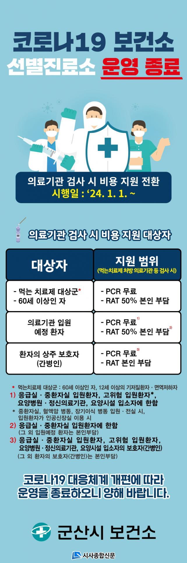 ¼±º°Áø·á¼Ò ¿î¿µÀº Á¾·áµÇÁö¸¸, °íÀ§Ç豺¿¡ ´ëÇÑ Äڷγª19 Áø´Ü°Ë»ç Áö¿øÀº À¯ÁöµÇ¸ç ¡ãÄڷγª19 Áõ»óÀÌ ÀÖ´Â ¸Ô´Â Ä¡·áÁ¦ ´ë»ó±º(60¼¼ ÀÌ»óÀÎ ÀÚ, 12¼¼ ÀÌ»óÀÇ ±âÀúÁúȯÀÚ¡¤¸é¿ªÀúÇÏÀÚ), ¡ãÀÇ·á±â°ü ÀÔ¿ø ¿¹Á¤ ȯÀÚ(ÀÀ±Þ½Ç¡¤ÁßȯÀÚ½Ç, °íÀ§Çè ÀÔ¿øÈ¯ÀÚ, ¿ä¾çº´¿ø⸱Á¤½ÅÀÇ·á±â°ü⸱)ÀçȰÀÇ·á±â°ü ÀÔ¿øÈ¯ÀÚ, ³ëÀÎÀǷẹÁö½Ã¼³, Àå¾ÖÀÎ °ÅÁֽü³, Á¤½Å¿ä¾ç½Ã¼³ ÀÔ¼ÒÀÚ) ¹× ÇØ´ç ÀÔ¿øÈ¯ÀÚÀÇ »óÁÖ º¸È£ÀÚ(°£º´ÀÎ)´Â ÀÏ¹Ý ÀÇ·á±â°ü¿¡¼ PCR°Ë»ç¸¦ ¹«·á·Î ¹ÞÀ» ¼ö ÀÖ´Ù. ´Ü, ÀϹÝÀÔ¿ø ȯÀÚ¿Í º¸È£ÀÚ, °íÀ§Çè½Ã¼³ Á¾»çÀÚ µîÀº ÀÇ·á±â°ü¿¡¼ º»ÀκδãÀ¸·Î °Ë»ç¸¦ ¹Þ¾Æ¾ß ÇÑ´Ù.