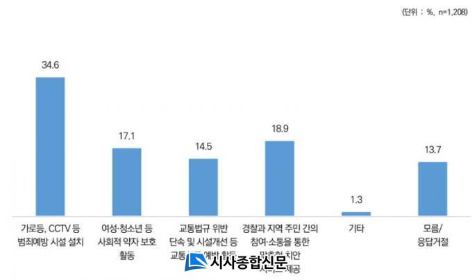 ¹üÁË¿¹¹æÀÇ È¿°úÀûÀÎ Ä¡¾È Á¤Ã¥Àº ¡®¹üÁË ¿¹¹æ ½Ã¼³ ¼³Ä¡¡¯(41.4%), ¡®¾î¸£½Å ´ë»ó ¹üÁË ¿¹¹æ ¼øÂû¡¯(30%), ¡®¸ÂÃãÇü Ä¡¾È ¼ºñ½º Á¦°ø¡¯(20.3%) ¼øÀ¸·Î ´äÇß´Ù.