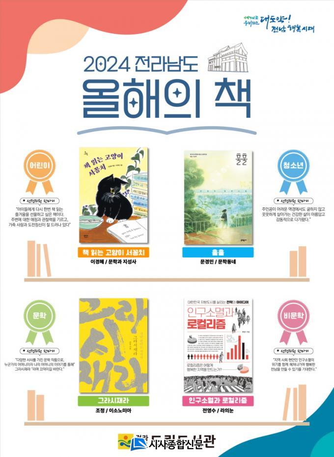 ¿ÃÇØÀÇ Ã¥ ¼±Á¤Àº Àü³²Áö¿ª µµ¼°ü°ú µµ¹ÎÀ¸·ÎºÎÅÍ Ãßõ ¹ÞÀº Ã¥À» ´ë»óÀ¸·Î Áö¿ª ÀÛ°¡¿Í ±³¼ö, »ç¼±³»ç µî 16¸íÀ¸·Î ±¸¼ºµÈ µµ¼¼±Á¤À§¿øÈ¸ ½É»ç, ¿Â¶óÀΰú ÇöÀå µµ¹ÎÅõÇ¥ °á°ú¸¦ ¹Ý¿µÇØ ÀÌ·ïÁ³´Ù. ¹®ÇÐ, ºñ¹®ÇÐ, û¼Ò³â, ¾î¸°ÀÌ 4°³ ºÐ¾ß·Î ³ª´² °¢ 1±Ç¾¿ ¼±Á¤Çß´Ù.
