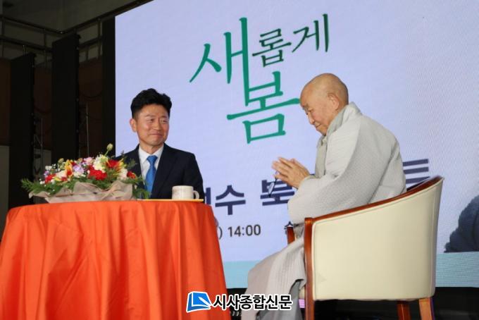 Áö¸®»ê ½Ç»ó»ç ȸÁÖ µµ¹ý½º´ÔÀÌ ÀúÀÚ¿ÍÀÇ ´ë´ã ÆÐ³Î·Î ¼Ò°³µÇ¾î Âü¿©ÇÑ ½Ã¹Îµé·ÎºÎÅÍ ¶ß°Å¿î ȯ¿µÀÇ ¹Ú¼ö¿Í ȯ¼ºÀÌ ÅÍÁ® ³ª¿Ô´Ù.