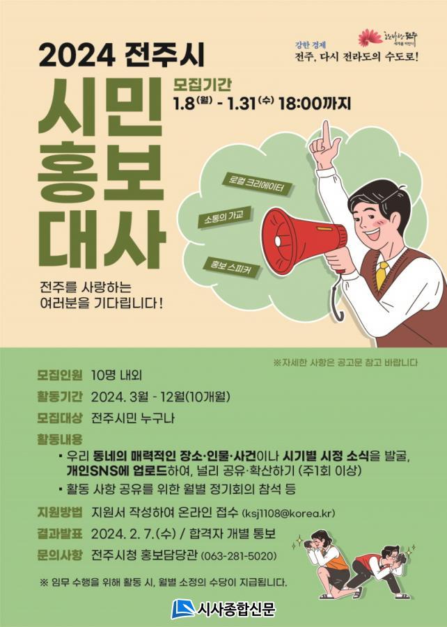 ½Ã¹ÎÈ«º¸´ë»ç¿¡´Â ÀüÁֽùÎÀÌ¸é ´©±¸³ª ½ÅûÇÒ ¼ö ÀÖÀ¸¸ç, ¸ðÁýÀοøÀº 10¸íÀÌ´Ù. ÀüÁֽô Á¢¼öµÈ Áö¿ø¼¸¦ Åä´ë·Î ÀüÁÖ¿¡ ´ëÇÑ ÀÌÇØµµ¿Í Áö¿ª ±â¹Ý¼º, ºí·Î±×¡¤ÀνºÅ¸ µî °³ÀÎ SNS Ȱ¿ëµµ¸¦ ±âÁØÀ¸·Î È«º¸´ë»ç¸¦ ¼±¹ßÇÒ ¿¹Á¤ÀÌ´Ù.