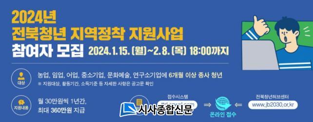 ½Åû Èñ¸ÁÀÚ´Â ÀüºÏû³â Áö¿ªÁ¤Âø Áö¿ø»ç¾÷ ´©¸®Áý(ttd.ezwel.com) ¶Ç´Â ÀüºÏû³âÇãºê¼¾ÅÍ(www.jb2030.or.kr)¸¦ ÅëÇØ ¿Â¶óÀÎÀ¸·Î ½ÅûÇÒ ¼ö ÀÖ´Ù. Á¢¼ö ±â°£Àº 1¿ù 15ÀÏ(¿ù)ºÎÅÍ 2¿ù 8ÀÏ(¸ñ)±îÁö´Ù. Áö¿ø´ë»óÀ¸·Î ¼±Á¤µÈ û³âµéÀº ¿ù 30¸¸ ¿ø¾¿ 1³â°£ ½Å¿ë(üũ)Ä«µå ¿¬°è Æ÷ÀÎÆ® ¹æ½ÄÀ¸·Î ¼ö´çÀ» Áö±Þ¹Þ´Â´Ù. °Ç°°ü¸®, Àڱⰳ¹ß, ¹®È·¹Àú µî »ç¿ë °¡´É ¾÷Á¾¿¡ ÇØ´çÇÏ´Â µµ³» »ç¾÷Àå¿¡¼ ÀÚÀ¯·Ó°Ô »ç¿ëÇÒ ¼ö ÀÖ´Ù.