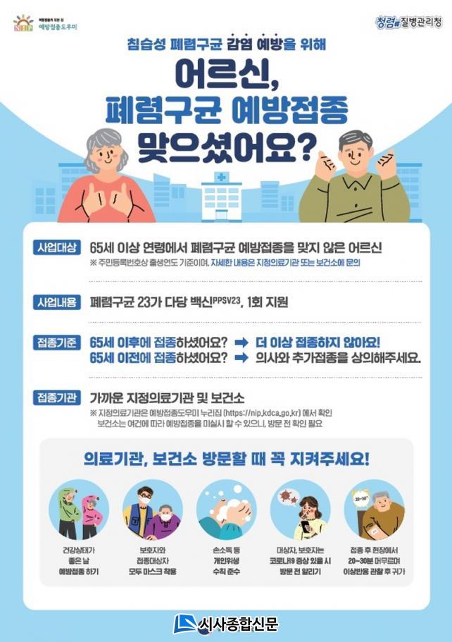 ¿ÃÇØ Æó·Å±¸±Õ ¹«·áÁ¢Á¾ ´ë»óÀÚ´Â Æó·Å±¸±Õ 23°¡ ´Ù´ç¹é½Å(PPSV 23)À» ÇÑ ¹øµµ Á¢Á¾ÇÏÁö ¾ÊÀº 65¼¼ ÀÌ»ó ¾î¸£½ÅÀ¸·Î, Àü±¹ º¸°Ç¼Ò ¹× ÁöÁ¤ À§Å¹ÀÇ·á±â°ü ¾î´À °÷¿¡¼³ª ¹«·á·Î 1ȸ Á¢Á¾ÀÌ °¡´ÉÇÏ´Ù.