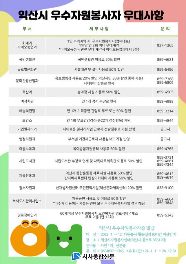 ÀÍ»ê½Ã´Â Àü³âµµ ÀÚ¿øºÀ»çȰµ¿ ½ÇÀûÀÌ 80½Ã°£ ÀÌ»óÀÎ ÀÚ¿øºÀ»çÀÚ¿¡°Ô ¿ì¼ö ÀÚ¿øºÀ»çÀÚÁõÀ» ¹ß±ÞÇÏ°í °ø°ø½Ã¼³ ÀÌ¿ë ¿ä±Ý ÇÒÀÎ µîÀÇ ÇýÅÃÀ» Á¦°øÇÑ´Ù°í 17ÀÏ ¹àÇû´Ù.