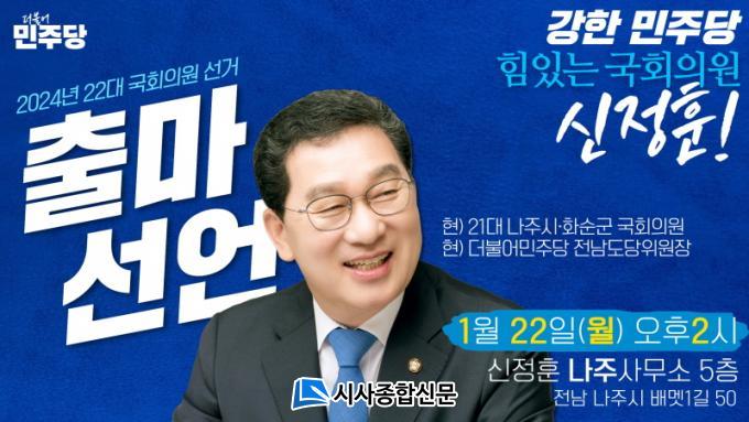 [½Ã»çÁ¾ÇսŹ® = ¿À½ÂÅà ±âÀÚ] ½ÅÁ¤ÈÆ ±¹È¸ÀÇ¿ø(¹ÎÁÖ´ç ³ªÁÖ¡¤È¼ø)ÀÌ ¿À´Â 22ÀÏ ¿ÀÀü 9½Ã Èĺ¸ÀÚ µî·ÏÀ» ¸¶Ä£ ÈÄ ¿ÀÈÄ 2½Ã ³ªÁÖÁö¿ª»ç¹«¼Ò¿¡¼ ±âÀÚȸ°ßÀ» ¿°í, 4¿ù ÃѼ±¿¡¼ ³ªÁÖ¡¤È¼ø ¼±°Å±¸ 3¼± µµÀüÀ» ¼±¾ðÇÑ´Ù.