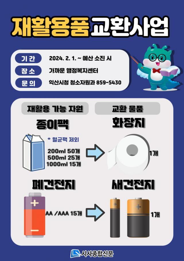 ÀÍ»ê½Ã´Â ´ÙÀ½´Þ 1ÀϺÎÅÍ ÆóÀÚ¿øÀÇ ÀçȰ¿ë °¡Ä¡ Áõ´ë¿Í ½Ã¹ÎÀÇ ÀÚ¹ßÀûÀÎ Âü¿© È®»êÀ» À§ÇØ 'ÀçȰ¿ëǰ ¼ö°Å ±³È¯¹°Ç° Áö¿ø »ç¾÷'À» ½ÃÇàÇÑ´Ù°í 24ÀÏ ¹àÇû´Ù. ´ë»ó ÀçȰ¿ëǰÀº Á¾ÀÌÆÑ°ú Æó°ÇÀüÁö·Î °¡±î¿î À¾¡¤¸é¡¤µ¿ ÇàÁ¤º¹Áö¼¾ÅÍ¿¡ °¡Á®°¡¸é ÈÀåÁö¿Í °ÇÀüÁö·Î ±³È¯ÇØÁØ´Ù.