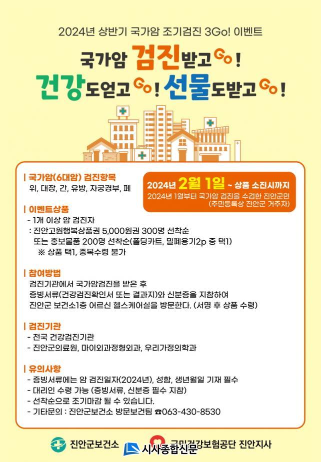 ¾ÏÀº ¿ì¸®³ª¶ó »ç¸Á¿øÀÎ 1À§ÀÌÁö¸¸ Á¶±â¹ß°ß ½Ã 90%ÀÌ»ó ¿ÏÄ¡ÇÒ ¼ö ÀÖ´Ù. À̹ø À̺¥Æ®´Â ¾ÏÀ» Á¶±â¿¡ ¹ß°ßÇÏ¿© Ä¡·áÀ²À» ³ôÀÓÀ¸·Î½á ¾Ï »ç¸Á·üÀ» °¨¼Ò½ÃŰ°í ¿¬¸» °ËÁø ½ò¸²À¸·Î ÀÎÇÑ °ËÁø Áö¿¬ ¹× ¼ºñ½º Áú ÀúÇϸ¦ ¿¹¹æÇϱâ À§ÇÔÀ¸·Î Áø¾È±º¹Î(Áֹεî·Ï»ó Áø¾È±º ÁÖ¼Ò)Àº ´©±¸³ª Âü¿©ÇÒ ¼ö ÀÖ´Ù.
