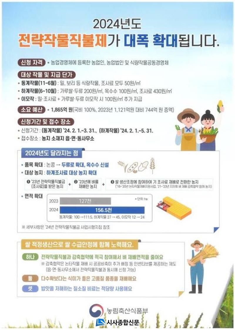 µ¿°èÀÛ¹° ¼±Áö±ÞÀ» À§ÇÏ¿©, µ¿°èÀÛ¹°Àº 2¿ù 1ÀϺÎÅÍ 3¿ù 31ÀϱîÁö, ÇϰèÀÛ¹°Àº 2¿ù 1ÀϺÎÅÍ 5¿ù 31ÀϱîÁö ºÐ¸®Á¢¼ö¸¦ ÃßÁøÇÑ´Ù.Àü·«ÀÛ¹°Á÷ºÒÁ¦´Â ½Ä·®ÀÚ±Þ·ü Çâ»ó ¹× ½Ò ¼ö±Þ¾ÈÁ¤ µµ¸ð, ³í ÀÌ¿ë·ü Á¦°í µîÀ» À§ÇÑ Á¤Ã¥À¸·Î, Áö±Þ´ë»ó ³í¿¡¼ Àü·«ÀÛ¹°À» Àç¹èÇÏ´Â ³ó¾÷ÀΡ¤³ó¾÷¹ýÀο¡°Ô ¼Òµæ¾ÈÁ¤À» À§ÇÏ¿© Á÷ºÒ±ÝÀ» Áö±ÞÇÑ´Ù.