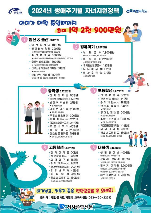 Áø¾È±º ´ëÇ¥ ÀÚ³àÁö¿øÁ¤Ã¥Àº ¡ßÀӽš¤Ãâ»ê ºÐ¾ß 884¸¸¿ø¡²▴ÀÓ½ÅÃàÇϱÝ(100¸¸¿ø) ▴Ãâ»êÀå·Á±Ý(ù°¾Æ 300¸¸¿ø, µÑ°¾Æ 500¸¸¿ø, ¼Â°¾Æ ÀÌ»ó 1,000¸¸¿ø) ▴Ãâ»êºÎ »êÈÄÁ¶¸®ºñ(100¸¸¿ø) ▴»ê¸ð½Å»ý¾Æ °Ç°°ü¸®Áö¿ø(74¸¸¿ø)¡³À» ºñ·ÔÇØ ¡ß¿µÀ¯¾Æ ±â°£ 2,989¸¸¿ø¡²▴ºÎ¸ð±Þ¿©(1,800¸¸¿ø) ▴¾Æµ¿¼ö´ç(960¸¸¿ø) ▴ģȯ°æ±Þ½ÄÁö¿ø(187¸¸¿ø)¡³, ¡ß ÃʵîÇлý 1,476¸¸¿ø¡²▴û¼Ò³â µå¸²Ä«µå(180¸¸¿ø/¿ù3¸¸¿ø)▴½Â¸¶Ã¼Çè(192¸¸¿ø/¿¬10ȸ)▴ÁÖ¸» ½ºÆ÷Ã÷µ¥ÀÌ(400¸¸¿ø/½Â¸¶,°ñÇÁ,º¼¸µ,Å״Ͻº,¾ß±¸µî) ▴¿µ¾îÀÎÀ罺Äð(200¸¸¿ø/È»ó¿µ¾î µî)¡³µîÀÌ´Ù.