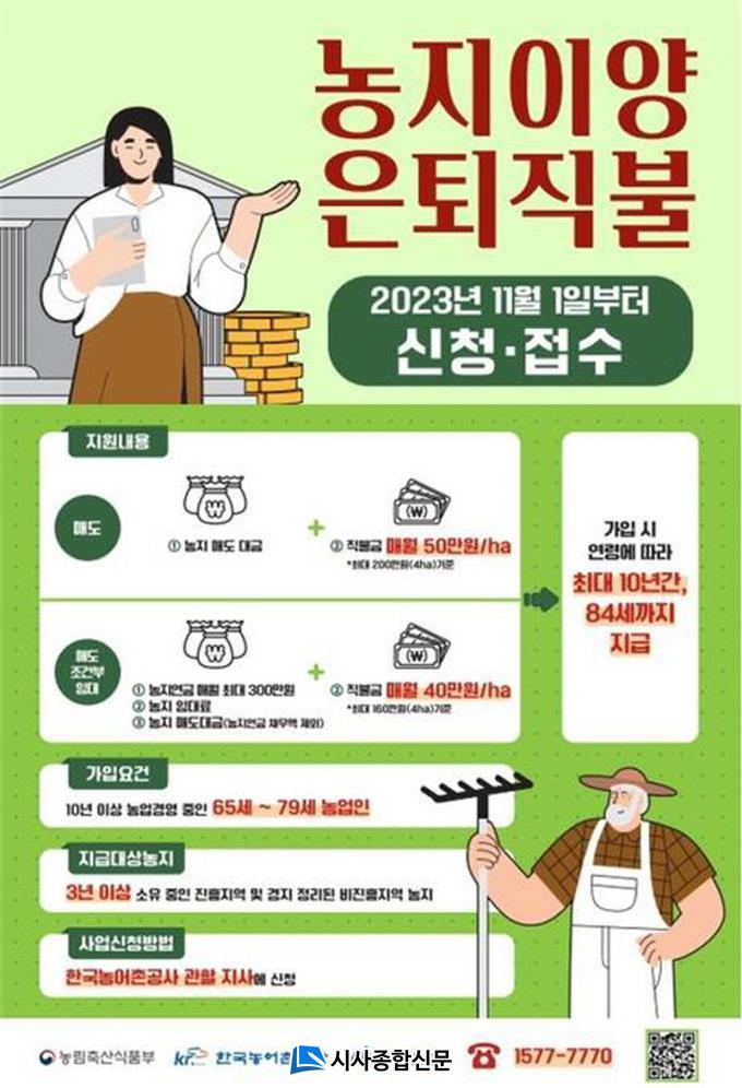 ³óÁöÀ̾çÀºÅðÁ÷ºÒ»ç¾÷Àº ±âÁ¸ÀÇ ¡°°æ¿µÀ̾çÁ÷ºÒ¡±À» ¡°³óÁöÀ̾çÀºÅðÁ÷ºÒ¡±·Î È®´ë°³ÆíÇÑ »ç¾÷À¸·Î 10³âÀÌ»ó °è¼ÓÇØ¼ ³ó¾÷¿¡ Á¾»çÇÑ 65¼¼ÀÌ»ó 79¼¼ÀÌÇÏÀÇ ³ó¾÷ÀÎÀÌ¸é¼ ³ó¾÷ÁøÈïÁö¿ª ³óÁö³ª ³ó¾÷ÁøÈïÁö¿ª ¹ÛÀÏ °æ¿ì °æÁöÁ¤¸®°¡ ¿Ï·áµÈ ³óÁö¸¦ 3³âÀÌ»ó ¼ÒÀ¯Çϰí ÀÖ¾î¾ß ½ÅûÀÌ °¡´ÉÇÏ´Ù.