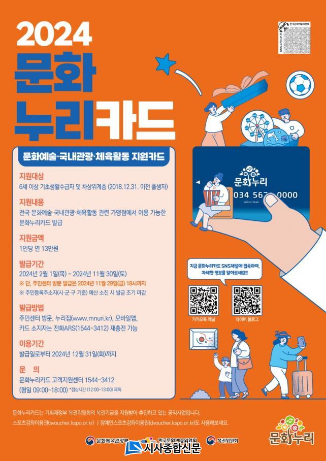 ¹®È´©¸®Ä«µå´Â 6¼¼ ÀÌ»ó(2018. 12. 31. ÀÌÀü Ãâ»ý) ±âÃÊ»ýȰ¼ö±ÞÀÚ¿Í Â÷»óÀ§°èÃþÀÌ ¹®È¿¹¼ú¡¤¿©ÇࡤüÀ°È°µ¿¿¡ »ç¿ëÇÒ ¼ö ÀÖµµ·Ï ¹ß±ÞÇÏ´Â Àü¿ë Ä«µå´Ù. ±×µ¿¾È 1Àδç Áö¿ø±ÝÀº ¿¬°£ 11¸¸ ¿øÀ̾úÁö¸¸, ¿ÃÇØºÎÅÍ 13¸¸ ¿øÀ¸·Î 2¸¸ ¿ø ´õ Áö¿øÇÑ´Ù.