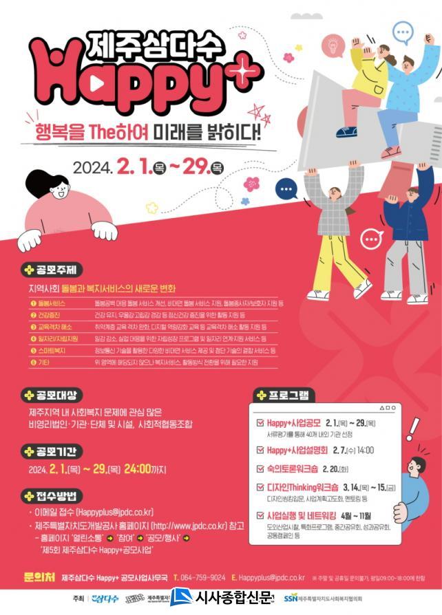 ¿ÃÇØ 5ȸ°ÀÎ ¡®Á¦ÁÖ»ï´Ù¼ö Happy+°ø¸ð»ç¾÷¡¯Àº Á¦ÁÖµµ°³¹ß°ø»ç°¡ ÁÖÃÖÇϰí, Á¦ÁÖ»çȸº¹Áö°øµ¿¸ð±Ýȸ¿Í Á¦ÁÖÆ¯º°ÀÚÄ¡µµ»çȸº¹ÁöÇùÀÇȸ°¡ °øµ¿À¸·Î ÁÖ°üÇϰí ÀÖ´Ù. ¸Å³â µµ³» º¹Áö »ç°¢Áö´ë ÇØ¼Ò¸¦ À§ÇÑ °ø¸ð»ç¾÷À» ÃßÁøÇϰí ÀÖ´Ù. À̹ø °ø¸ð»ç¾÷ ÁÖÁ¦´Â ¡®Áö¿ª»çȸ µ¹º½°ú º¹Áö¼ºñ½ºÀÇ »õ·Î¿î º¯È¸¦ ½ÃµµÇÏ´Â ÇÁ·ÎÁ§Æ®¡¯´Ù. Àüü »ç¾÷ºñ¸¸ 6¾ï ¿ø »ó´çÀ¸·Î ±â°ü´ç ÃÖ´ë 3õ¸¸ ¿øÀÌ Áö¿øµÈ´Ù.±¸Ã¼ÀûÀÎ °ø¸ð ³»¿ëÀº ¡âµ¹º½¼ºñ½º ¡â°Ç°ÁõÁø ¡â±³À°°ÝÂ÷ ÇØ¼Ò ¡âÀÏÀÚ¸®‧ÀÚ¸³Áö¿ø ¡â½º¸¶Æ®º¹Áö´Ù.
