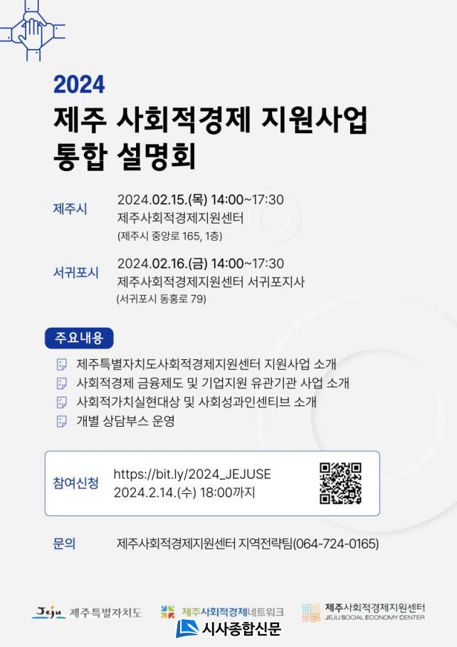 [½Ã»çÁ¾ÇսŹ® = °í¼º¹Î ±âÀÚ] Á¦ÁÖÆ¯º°ÀÚÄ¡µµ»çȸÀû°æÁ¦Áö¿ø¼¾ÅÍ(¼¾ÅÍÀå ÀÓÇöÁ¤)´Â Á¦ÁÖµµ³» »çȸÀû°æÁ¦±â¾÷ ´ëÇ¥ ¹× ÀÓÁ÷¿øÀ» ´ë»óÀ¸·Î ¿À´Â 15ÀÏ(Á¦ÁÖ½Ã)°ú 16ÀÏ(¼±ÍÆ÷½Ã), ¡®2024 Á¦ÁÖ »çȸÀû°æÁ¦ Áö¿ø»ç¾÷ ÅëÇÕ ¼³¸íȸ¡¯¸¦ °³ÃÖÇÑ´Ù.