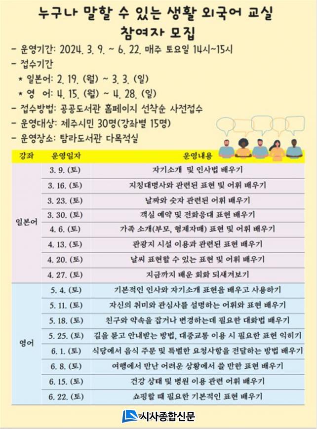 À̹ø¿¡ ¿î¿µµÇ´Â ¿Ü±¹¾î ±³½ÇÀº ÀϺ»¾î±³½Ç°ú ¿µ¾î±³½Ç·Î ±¸¼ºµÇ¸ç, ¿À´Â 3¿ù 9ÀϺÎÅÍ 6¿ù 22ÀϱîÁö ¸ÅÁÖ Åä¿äÀÏ ¿ÀÈÄ 2½ÃºÎÅÍ 1½Ã°£ µ¿¾È Áö¿ªÁֹΠ15¸íÀ» ´ë»óÀ¸·Î ޶󵵼°ü ´Ù¸ñÀû½Ç¿¡¼ ÁøÇàÇÒ ¿¹Á¤ÀÌ´Ù.