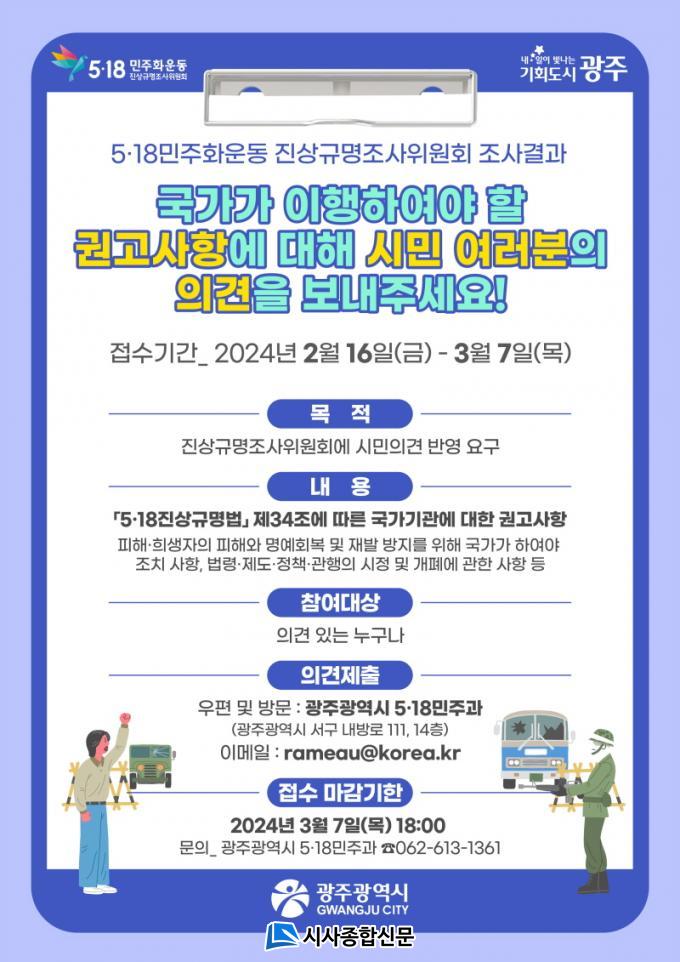 ½Ã¹Î ÀǰßÁ¢¼ö´Â 16ÀϺÎÅÍ 3¿ù 7ÀϱîÁö ÁøÇàµÇ¸ç, ±¹°¡¿¡ ´ëÇÑ ±Ç°í»çÇ× °ü·Ã ÀǰßÀÌ ÀÖ´Â ½Ã¹ÎÀº ½ÃûÀ» ¹æ¹®Çϰųª µî±â¿ìÆí(±¤ÁÖ±¤¿ª½Ã ¼±¸ ³»¹æ·Î 111, 5¡¤18¹ÎÁÖ°ú(Ä¡Æòµ¿)), À̸ÞÀÏ(rameau@korea.kr)·Î Á¦ÃâÇÏ¸é µÈ´Ù. ´Ù¸¸ ÀçÆÇ ¶Ç´Â ¼ö»ç ÁßÀÎ »ç°Ç, 5¡¤18¿ª»ç¿Ö°î ¹× ÆïÈÑ, ÇãÀ§¡¤ºñ¹æ, ÀÍ¸í¿¡ ÀÇÇÑ Á¦¾È µîÀº Á¦¿ÜµÈ´Ù.