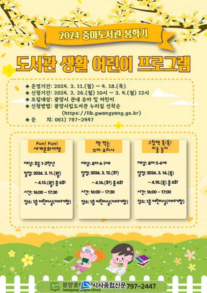 [½Ã»çÁ¾ÇսŹ® = Àå¹Î±Ô ±âÀÚ] ±¤¾çÁ߸¶µµ¼°üÀº º½Çб⸦ ¸Â¾Æ ¿À´Â 3¿ù 11ÀϺÎÅÍ 4¿ù 18ÀϱîÁö 6ÁÖ µ¿¾È ¾î¸°ÀÌ(À¯¾Æ 5~7¼¼)¿Í ÃʵîÇлý(1~2Çгâ)À» ´ë»óÀ¸·Î µµ¼°ü »ýȰ ¾î¸°ÀÌ ÇÁ·Î±×·¥À» ¿î¿µÇÑ´Ù.