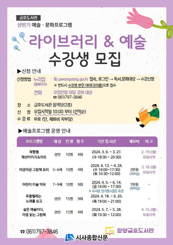 ¿¹¼ú¡¤¹®ÈÇÁ·Î±×·¥ ¿î¿µ¿¡ °üÇÑ ÀÚ¼¼ÇÑ ³»¿ëÀº ½Ã¸³µµ¼°ü ´©¸®ÁýÀ» ¹æ¹®Çϰųª ±ÝÈ£µµ¼°ü(¢Ï061-797-3846)À¸·Î ¹®ÀÇÇÏ¸é µÈ´Ù.