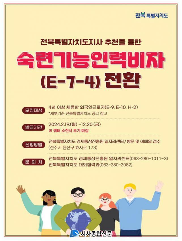 ¼÷·Ã±â´ÉÀη ºñÀÚ(E-7-4) Àüȯ ¹ß±Þ ½ÅûÀº ¿Ü±¹ÀÎ º»ÀÎÀÌ ÀüºÏÀÚÄ¡µµ Ãßõ °á°ú Å뺸 ÈÄ, ¹ý¹«ºÎ ÇÏÀÌÄÚ¸®¾Æ(www.hikorea.go.k)¿¡¼ ½ÅûÇÏ¸é µÈ´Ù. µµÁö»ç Ãßõ¼°¡ ÇÊ¿äÇÑ ´ë»óÀÚ´Â 2¿ù 19ÀϺÎÅÍ 12¿ù 20ÀϱîÁö ÀüºÏƯº°ÀÚÄ¡µµ °ø°í¹®À» Âü°íÇÏ¿© °ü·Ã ¼·ù ±¸ºñ ÈÄ, ÀüºÏƯº°ÀÚÄ¡µµ °æÁ¦Åë»óÁøÈï¿ø ÀÏÀÚ¸®¼¾Å͸¦ ÅëÇØ ÀÎÅͳÝÀ¸·Î ½ÅûÇϰųª ¹æ¹® ½ÅûÇÏ¸é µÈ´Ù.