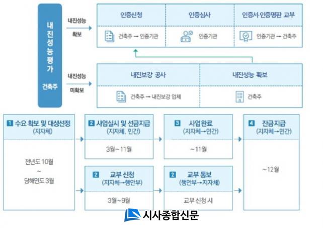 À̹ø Áö¿ø»ç¾÷Àº ±¹ºñ10%, Áö¹æºñ 10%, Àںδã80%·Î ½Ç½ÃµÇ¸ç ³»Áøº¸°°ø»ç¿¡ ¼Ò¿äµÇ´Â ºñ¿ëÀÇ 20%(ÃÖ´ë 5¾ï¿ø)À» Áö¿øÇÑ´Ù. ÁöÁø¾ÈÀü ½Ã¼³¹° ÀÎÁõÀýÂ÷ ÁøÇà Áß ³»Áø¼º´ÉÆò°¡ °á°ú°¡ ³»Áø¼º´É ¹ÌÈ®º¸·Î ³ª¿Â °æ¿ì, ¡®¹Î°£°ÇÃ๰ ³»Áøº¸°ºñ¿ë Áö¿ø »ç¾÷¡¯À» ÅëÇØ ³»Áøº¸° °ø»ç ºñ¿ëÀ» Áö¿ø¹ÞÀ» ¼ö ÀÖ´Ù.