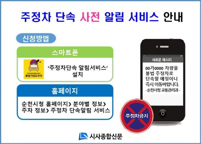 ÇÑÆí, ½Ã´Â ÁÖÁ¤Â÷ ±ÝÁö±¸¿ª¿¡ ÁÖÂ÷ÇÑ ¿îÀüÀÚ¿¡°Ô ´Ü¼ÓµÉ ¿¹Á¤ÀÓÀ» ¹®ÀÚ·Î »çÀü ¾È³»ÇÏ´Â ¾Ë¸² ¼ºñ½ºµµ ¿î¿µÇϰí ÀÖ´Ù. ÇØ´ç ¼ºñ½º °¡ÀÔÀº ¼øÃµ½Ã ȨÆäÀÌÁö(www.suncheon.go.kr) ¹æ¹® ½Åû ¶Ç´Â ½º¸¶Æ®Æù ¡®ÁÖÁ¤Â÷ ´Ü¼Ó ¾Ë¸² ¼ºñ½º¡¯ ¾Û ¼³Ä¡¸¦ ÅëÇØ °¡´ÉÇÏ´Ù.