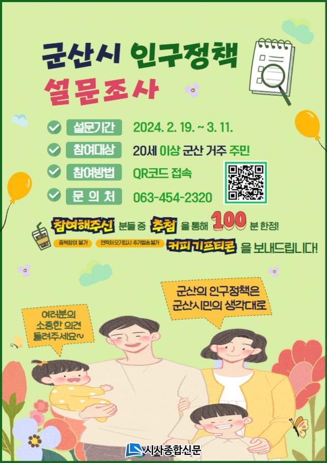 Á¶»ç ³»¿ëÀº °áÈ¥․Ãâ»ê․¾çÀ°°ú Á¤ÁÖ ¿©°ÇÀ» ºñ·ÔÇÑ Àα¸¹®Á¦ Àü¹Ý¿¡ ´ëÇÑ ÀÎ½Ä µî °ü·ÃµÈ 4°³ ºÐ¾ß 18°³ ¹®Ç×À¸·Î ±¸¼ºµÆ´Ù. ¼³¹®Á¶»ç´Â ¿Â¡¤¿ÀÇÁ¶óÀο¡¼ µ¿½Ã¿¡ ½Ç½ÃµÇ¸ç Âü¿©¹æ¹ýÀº ±º»ê½Ãû ȨÆäÀÌÁö ¶Ç´Â ºí·Î±× µî ¼Ò¼È¹Ìµð¾îÀÇ QRÄڵ忡 Á¢¼ÓÇØ ¹®Ç׿¡ ´äº¯ÇÏ¸é µÈ´Ù.