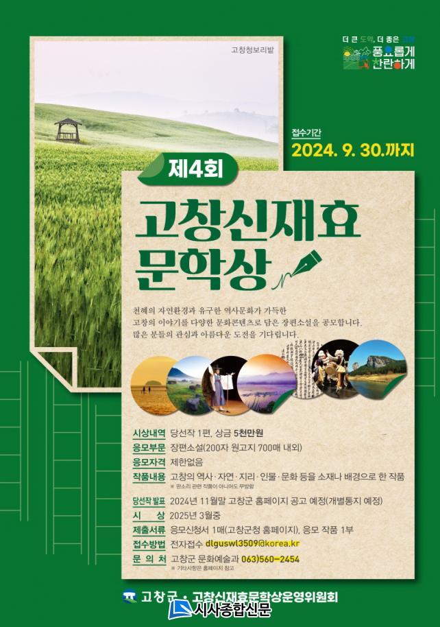 Á¦4ȸ °íâ½ÅÀçÈ¿¹®ÇлóÀº âÀÛÀåÆí¼Ò¼³ ºÐ¾ß·Î Àü±¹ °ø¸ð¸¦ ÅëÇØ ÁøÇàµÇ¸ç, ´ç¼±ÀÛ¿¡´Â ´ëÇѹα¹ ¹®Çлó ÃÖ°í ¼öÁØ¿¡ »ó´çÇÏ´Â 5000¸¸¿øÀÇ ½Ã»ó±ÝÀÌ ÁÖ¾îÁö°Ô µÈ´Ù. ½ÅÀΰú ±â¼ºÀÛ°¡¸¦ ¸··ÐÇÑ ¼ö¸¹Àº ÀÛ°¡°¡ Âü¿©ÇØ °íâ¿¡ °üÇÑ °ü½ÉÀ» ºÒ·¯ÀÏÀ¸Å°°í, ÇâÈÄ ¿µÈ, µå¶ó¸¶, ¹ÂÁöÄà µî ´Ù¾çÇÑ ¹®ÈÄÜÅÙÃ÷·Îµµ Á¦À۵Š´ëÇѹα¹À» ³Ñ¾î Àü ¼¼°è¿¡ °íâÀ» ¾Ë¸®´Â ¹®È°ü±¤ÀÚ¿øÀÌ µÉ °ÍÀ¸·Î ±â´ë¸¦ ¸ðÀ¸°í ÀÖ´Ù.
