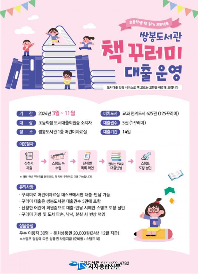 Çг⿡ ¸Â´Â ´Ü°è ²Ù·¯¹Ì¸¦ ¿ì¼±ÀûÀ¸·Î ´ëÃâÇÒ ¼ö ÀÖÀ¸¸ç, ÇØ´ç Çг⠸ñÇ¥ ´Þ¼º ÈÄ¿¡´Â ´ÙÀ½ ´Ü°è ²Ù·¯¹Ìµµ ÀÌ¿ëÇÒ ¼ö ÀÖ´Ù.´Ü°èº° ²Ù·¯¹Ì µµ¼ ¸ñ·ÏÀº ½Ã¸³½ÖºÀµµ¼°ü ¾î¸°ÀÌÀÚ·á½Ç°ú ¿©¼ö½Ã¸³µµ¼°ü ´©¸®Áý¿¡¼ È®ÀÎÇÒ ¼ö ÀÖ´Ù. ½Ã´Â 20°³ ÀÌ»óÀÇ Ã¥ ²Ù·¯¹Ì¸¦ ´ëÃâÇÑ ÀÌ¿ëÀÚ Áß ¼±Âø¼ø 30¸íÀ» ¼±Á¤, ¹®È»óǰ±ÇÀ» ¼±¹°ÇÏ´Â À̺¥Æ®µµ ¸¶·ÃÇß´Ù.