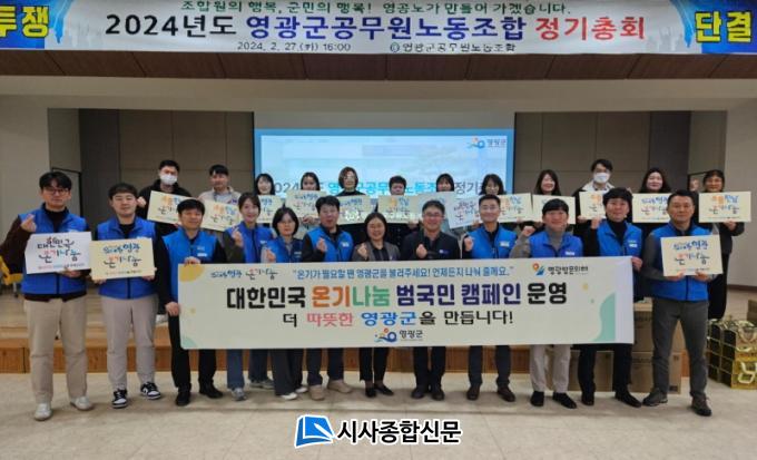 [½Ã»çÁ¾ÇսŹ® = ¿À½ÂÅà ±âÀÚ] ¿µ±¤±º°ø¹«¿ø³ëµ¿Á¶ÇÕ(À§¿øÀå Á¶¹ü±â)Àº Áö³ 27ÀÏ ¿µ±¤±ºÃ» 3Ãþ ´ëȸÀǽǿ¡¼ 300¿© ¸íÀÇ Á¶ÇÕ¿øÀÌ Âü¼®ÇÑ °¡¿îµ¥ 2024³âµµ Á¤±âÃÑȸ¸¦ ¿°í ¿µ±¤±º(±º¼ö °Á¾¸¸)¿¡¼ ÃßÁø ÁßÀÎ ¿Â±â³ª´® ¸±·¹ÀÌ Ä·ÆäÀο¡ µ¿ÂüÇÏ¿´´Ù.