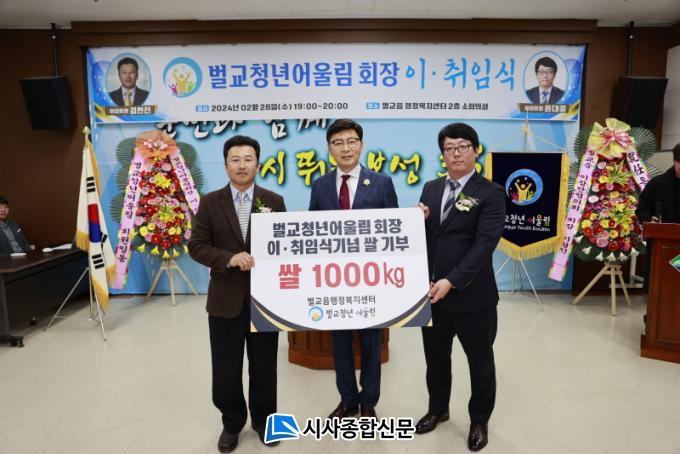 | ¹ú±³Ã»³â¾î¿ï¸² ȸÀå ÀÌ․ÃëÀÓ½ÄÀ» ±â³äÇØ ÀÌÀÓÇÑ Àü ±èÇöÁø ȸÀå(¿ÞÂÊ), ±èö¿ì ±º¼ö(°¡¿îµ¥), À±´ëÁß ÃëÀÓ È¸ÀåÀÌ ¹é¹Ì 1,000kg ±âºÎ ±â³ä ÃÔ¿µÀ» Çϰí ÀÖ´Ù. |