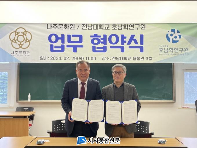 [½Ã»çÁ¾ÇսŹ® = ¿À½ÂÅà ±âÀÚ] Àü³²´ëÇб³ È£³²Çבּ¸¿ø(¿øÀå Á¤¸íÁß)°ú ³ªÁÖ¹®È¿ø(¿øÀå À±¿©Á¤)ÀÌ Áö³ 2¿ù 29ÀÏ ¾÷¹«Çù¾àÀ» ü°áÇϰí, Áö¿ªÇÐ ¹ßÀüÀ» À§ÇØ Çù·ÂÇϱâ·Î Çß´Ù.
