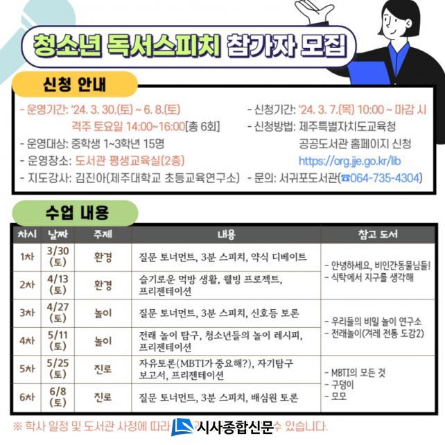 Âü°¡ ½ÅûÀº 3¿ù 7ÀÏ(¸ñ) ¿ÀÀü 10½ÃºÎÅÍ Á¦ÁÖÆ¯º°ÀÚÄ¡µµ±³À°Ã» °ø°øµµ¼°ü ȨÆäÀÌÁö(https://org.jje.go.kr/lib)¸¦ ÅëÇØ ½ÅûÇÒ ¼ö ÀÖ´Ù.