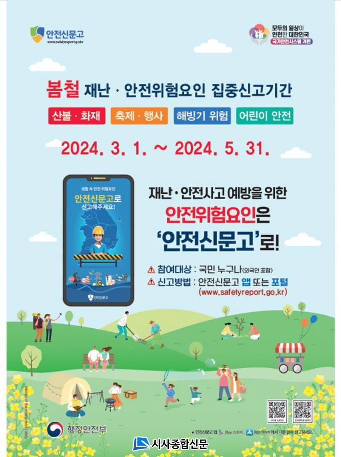 À̹ø º½Ã¶ ÁýÁß ½Å°í ´ë»óÀº ¡ã»êºÒ¡¤ÈÀç(ºÒ¹ý ¼Ò°¢ µî) ¡ãÃàÁ¦¡¤Çà»ç(ÀÎÆÄ¹ÐÁý µî) ¡ãÇØºù±â À§Çè(ºØ±«, ³«¼® µî) ¡ã¾î¸°ÀÌ ¾ÈÀü(ÅëÇзÎ, ³îÀ̽ü³ µî) °ü·Ã ÃÑ 4°¡Áö À¯ÇüÀ̸ç, ¡®¾ÈÀü½Å¹®°í¡¯¸¦ ÅëÇØ ½Å°í¸¦ Á¢¼öÇϰí ÀÖ´Ù.