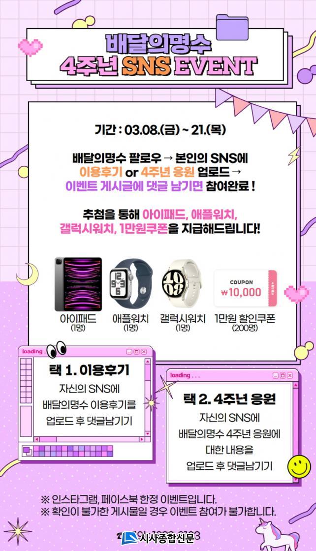 ¹è´ÞÀÇ ¸í¼ö 4Áֳ⠰¨»ç À̺¥Æ®´Â 3¿ù 8ÀϺÎÅÍ 21ÀϱîÁö ÁøÇàµÇ¸ç, ÀÚ½ÅÀÇ SNS¿¡ ¡¸¹è´ÞÀǸí¼ö¡¹ ÀÌ¿ë Èı⠶Ǵ ÀÀ¿ø ¸Þ¼¼Áö¸¦ ¾÷·Îµå ÇÑ ÈÄ ÀÎÁõÇϸé Ãß÷À» ÅëÇØ ´Ù¾çÇÑ ¼±¹°À» ¹ÞÀ» ¼ö ÀÖ´Ù. 1µîÀº ¡®¾ÆÀÌÆÐµå¡¯, 2µîÀº ¡®¾ÖÇÿöÄ¡¡¯, 3µîÀº ¡®°¶·°½Ã¿öÄ¡¡¯, 4µîÀº 200¸íÀ» Ãß÷ÇÏ¿© 1¸¸¿ø ÇÒÀÎÄíÆùÀ» Á¦°øÇÑ´Ù.