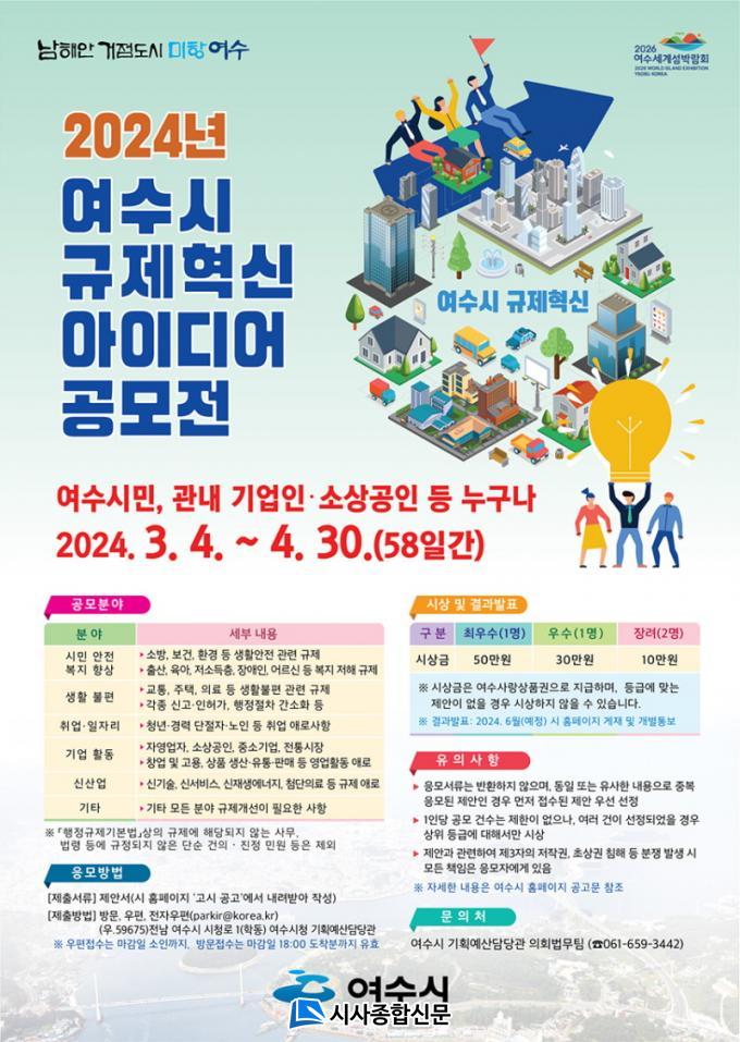 ÀÀ¸ð´Â ¿©¼ö½Ã ´©¸®Áý ¡®°í½Ã°ø°í¡¯¿¡ °Ô½ÃµÈ Á¦¾È¼¸¦ ÀÛ¼ºÇØ ½Ã ±âȹ¿¹»ê´ã´ç°ü½Ç¿¡ ¹æ¹®Çϰųª, ¿ìÆí ¶Ç´Â À̸ÞÀÏ·Î Á¦ÃâÇÏ¸é µÈ´Ù. Á¢¼öµÈ ¾ÆÀ̵ð¾î´Â ½ÇÇà°¡´É¼º°ú âÀǼº, È¿À²¼º․È¿°ú¼º µî 1Â÷ ¼Ò°üºÎ¼ °ËÅä ÈÄ ¿©¼ö½Ã ±ÔÁ¦°³ÇõÀ§¿øÈ¸ ½ÉÀǸ¦ °ÅÃÄ 6¿ù Áß ÃÖÁ¾ ¼ö»óÀÚ°¡ ¹ßÇ¥µÉ ¿¹Á¤ÀÌ´Ù.