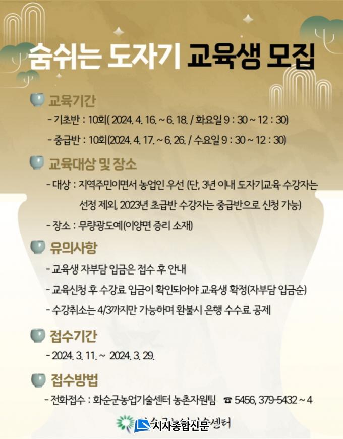 À̹ø ±³À°Àº À̾ç¸é ¡®¹«·®±¤µµ¿¹°ø¹æ¡¯¿¡¼ 4¿ù 16ÀϺÎÅÍ 6¿ù 26±îÁö ÃÑ 20ȸ(ÃÊ±Þ 10ȸ, Áß±Þ 10ȸ)¿¡ °ÉÃÄ ÁøÇàµÇ¸ç, Ãʱ޹ݰú Áß±Þ¹ÝÀ¸·Î ³ª´² ´Ù¾çÇÑ µµÀڱ⠼Òǰ ¸¸µé±â ÀÌ·Ð ¹× ½Ç½À ±³À°À¸·Î ÀÌ·ç¾îÁú ¿¹Á¤ÀÌ´Ù.°úÁ¤º° ¸ðÁý Á¤¿øÀº 12¸í¾¿ÀÌ¸ç ±³À° ½ÅûÀº 3¿ù 11ÀϺÎÅÍ ³ó¾÷±â¼ú¼¾ÅÍ ³óÃÌÀÚ¿øÆÀÀ» ¹æ¹®Çϰųª ÀüÈ(061-379-5456)·Î ½ÅûÇÏ¸é µÈ´Ù.