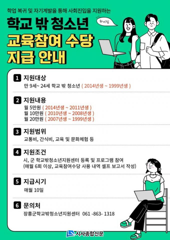 Áö¿ø±âÁØÀº ÀåÈﱺÇб³¹ÛÁö¿ø¼¾ÅÍ¿¡ µî·Ï ¹× ÇÁ·Î±×·¥ Âü¿©½Ã ÇØ´ç ¿¬·É(¸¸ 9¼¼~12¼¼ ¿ù 5¸¸¿ø, ¸¸ 13¼¼~15¼¼ ¿ù 10¸¸¿ø, ¸¸ 16¼¼~24¼¼ ¿ù 20¸¸¿ø)¿¡ µû¶ó Â÷µî Áö±ÞÇϰí ÀÖ´Ù. Çб³ ¹Û û¼Ò³â(¸¸ 9¼¼~24¼¼)ÀÌ¸é ´©±¸³ª ¹«·á·Î °ËÁ¤°í½Ã, Áø·ÎÁøÇÐ, °Ç°°ËÁø, ¹®ÈüÇè, µ¿¾Æ¸®È°µ¿ µî ´Ù¾çÇÑ ÇÁ·Î±×·¥¿¡ Âü¿© °¡´ÉÇÏ¸ç ±Þ½Äµµ Áö¿øÇϰí ÀÖ´Ù.