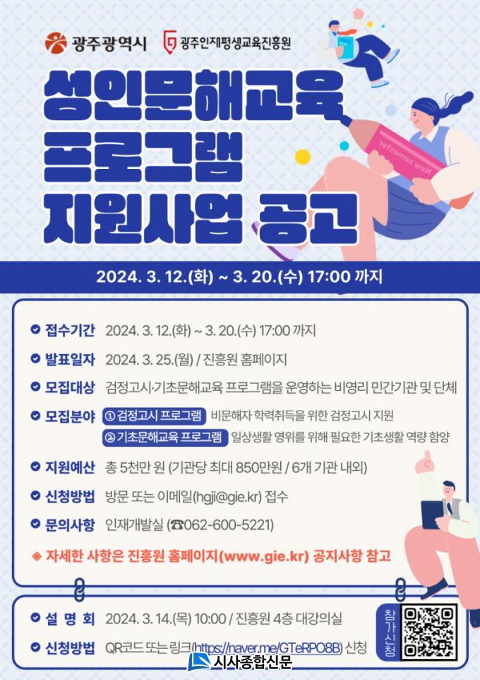 ±¤ÁÖ ¼ºÀι®Çر³À° ÇÁ·Î±×·¥ Áö¿ø»ç¾÷ »çÀü¼³¸íȸ´Â 3¿ù 14ÀÏ ¿ÀÀü 10½Ã, ÁøÈï¿ø 4Ãþ ´ë°Àǽǿ¡¼ °³ÃֵȴÙ. ¼³¸íȸ´Â »ç¾÷ Àü¹Ý¿¡ ´ëÇÑ ¼¼ºÎ»çÇ× ¾È³»¿Í ÁúÀÇÀÀ´äÀ¸·Î ÁøÇàµÈ´Ù. °ø¸ð¿¡ °ü½É ÀÖ´Â ±â°üÀº ÁøÈï¿ø ȨÆäÀÌÁö °ø°í¹® ³» QRÄڵ峪 ¸µÅ©¸¦ ÅëÇØ ½Åû ÈÄ Âü¿©ÇÒ ¼ö ÀÖ´Ù.
