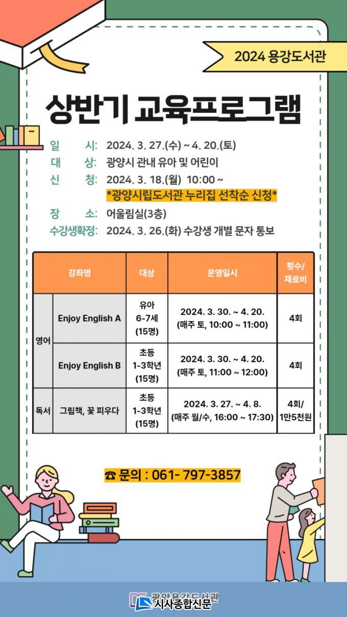 °³¼³ ÇÁ·Î±×·¥Àº ¡®¿µ¾î¡¯¿Í ¡®µ¶¼¡¯ °ÁÂÀÌ´Ù. ¿µ¾î °Á´ ¡ãÀ¯¾Æ 6~7¼¼ ´ë»ó ¡®Enjoy English A¡¯¿Í ¡ãÃʵîÇлý 1~3Çг⠴ë»ó ¡®Enjoy English B¡¯·Î, µ¶¼ °Á´ ¡ãÃʵîÇлý 1~3Çг⠴ë»ó ¡®±×¸²Ã¥, ²É ÇÇ¿ì´Ù¡¯°¡ ÁøÇàµÈ´Ù. ¿µ¾î °Á´ ¾î¸°ÀÌ¿Í ÃʵîÇлýµéÀÌ ½±°í Àç¹ÌÀÖ°Ô ¿µ¾î¸¦ Á¢Çϵµ·Ï ¿ø¾î¹Î °»çÀÇ »ýµ¿°¨ ³ÑÄ¡´Â ¼ö¾÷À¸·Î ÀÌ·ïÁø´Ù.