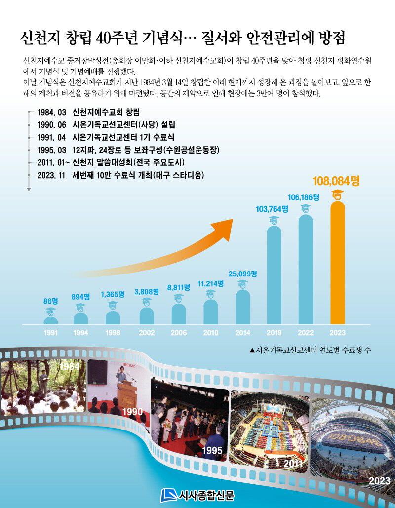 1991³â 1±â ¼ö·á½ÄÀ» °¡Áø ½Ã¿Â±âµ¶±³¼±±³¼¾ÅÍ´Â 2019³â 110±â ¼ö·á½Ä¿¡¼ 10¸¸3764¸íÀÇ ¼ö·á»ýÀ» ¹èÃâÇÏ¸é¼ Ã¹ ¡®10¸¸ ¼ö·á½Ä¡¯À» ÁøÇàÇß´Ù. ÀÌÈÄ 2022³â°ú 2023³â¿¡´Â °¢°¢ 10¸¸6186¸í°ú 10¸¸8084¸íÀÌ ¼ö·áÇÏ¸é¼ 2³â ¿¬¼Ó 10¸¸ ¼ö·á½ÄÀ̶ó´Â À¯·Ê¾ø´Â ¼º°ú¸¦ °Åµ×´Ù.