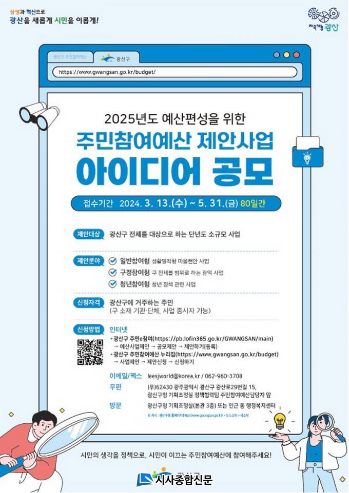 °ø¸ð ±â°£Àº 5¿ù 31ÀϱîÁö¸ç, ±¤»ê±¸ ÁֹΠ¶Ç´Â ±¸ ¼ÒÀç ±â°ü‧´Üü‧»ç¾÷ Á¾»çÀÚ µî ´©±¸³ª Âü¿©ÇÒ ¼ö ÀÖ´Ù. 2025³â ±¤»ê±¸ ÁÖ¹ÎÂü¿©¿¹»êÀº Àü³â ´ëºñ 1¾ï ¿øÀÌ Áõ°¡ÇÑ ÃÑ 13¾ï ¿ø ±Ô¸ð·Î, ¡âÀϹÝÂü¿©Çü(»ýȰ¹ÐÂøÇü ¸¶À»Çö¾È »ç¾÷) ¡â±¸Á¤Âü¿©Çü(±¸ Àüü¸¦ ¹üÀ§·Î ÇÏ´Â ±¤¿ª»ç¾÷) ¡âû³âÂü¿©Çü(û³â Á¤Ã¥ °ü·Ã »ç¾÷) 3°³ ºÐ¾ß·Î Á¦¾ÈÀ» ¹Þ´Â´Ù.