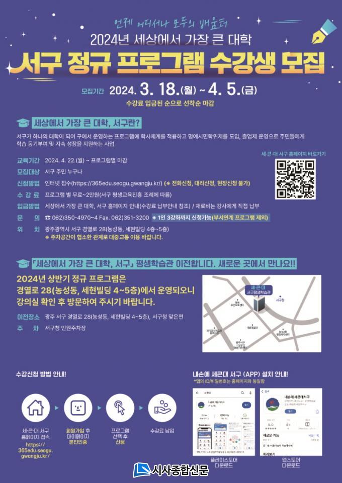 ¿î¿µ ÇÁ·Î±×·¥Àº ¡ã½Ã¹ÎÂü¿©Çаú 10°³ °úÁ¤(¿ì¸®¸¶À»»ýÅÂÇØ¼³»ç ¾ç¼º°úÁ¤ µî) ¡ãÀι®»çȸÇаú 7°³ °úÁ¤(Ä«ÇÁÄ«·Î Àд °¡Á· Àι®ÇÐ, ¼¾çöÇп¡¼ ¹è¿ì´Â »îÀÇ ÁöÇý µî) ¡ã¹®È¿¹¼úÇаú 9°³ °úÁ¤(½Ã´Ï¾î¸ðµ¨, ³» ¼ÕÀ¸·Î ¸¸µå´Â ¼ô ´ÜÆí¿µÈ µî) ¡ãÁֹΰǰÇаú 1°³ °úÁ¤(°È±âÁöµµÀÚ ¾ç¼º°úÁ¤) ¡ãÀü³²´ëÄ¿¹Â´ÏƼÇаú 3°³ °úÁ¤(È£³²ÀÇ ¼Á¤À» Àϱ¸¾î³½ ½ÃÀÎµé µî) ÃÑ 5°³ Çаú 30°³ °ÁÂÀ̸ç, 4¿ù 22ÀϺÎÅÍ »õ·Î ÀÌÀüÇÏ´Â ¼±¸Æò»ýÇнÀ°ü(°æ¿·Î 28, ³ó¼ºµ¿ ¼¼Çöºôµù 4Ãþ~5Ãþ)¿¡¼ ÁøÇàµÈ´Ù.