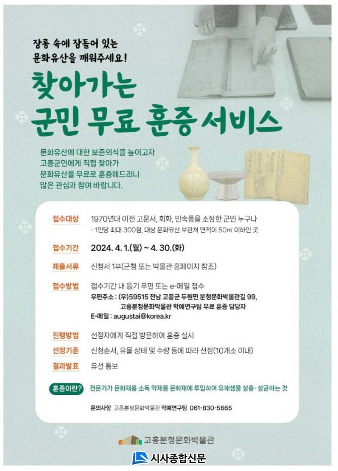 ¡®¹«·á ÈÆÁõ¡¯Àº °íÈïÁö¿ª ³» °³ÀÎÀ̳ª ´Üü µîÀÌ ¼ÒÀåÇϰí ÀÖ´Â ¹®ÈÀ¯»êÀ» ´ë»óÀ¸·Î Á÷Á¢ ã¾Æ°¡ ÈÆÁõ¼Òµ¶À» ÇØÁÖ´Â »ç¾÷ÀÌ´Ù.