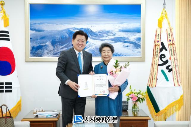 ¿À¿µÈÆ Áö»ç´Â À̳¯ À§Ã˽Ŀ¡¼ ¡°±è¼øÀÌ ½ÅÀÓ Á¦ÁÖ¹®Çаü ¸í¿¹°üÀåÀº Áö³ 50³â µ¿¾È Á¦ÁÖÀÇ ¹®ÇÐÀ» À̲ø¾î ¿Â ½ÃÀÎÀÌÀÚ ¹®ÇаèÀÇ »êÁõÀÎÀ¸·Î Á¦ÁÖÀÇ °¡Ä¡¸¦ ³ô¿©¿Ô´Ù¡±¸ç ¡°¾ÕÀ¸·Î ¸í¿¹°üÀåÀ¸·Î¼ Á¦ÁÖ¹®ÇÐÀ» ´õ¿í Ȱ¼ºÈ½Ã۵µ·Ï Èû½á´Þ¶ó¡±°í ¸»Çß´Ù.