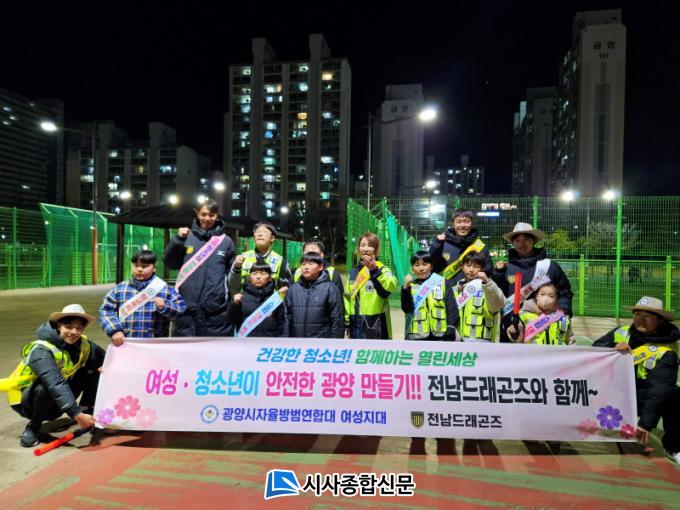 Àü³²µå·¡°ïÁî´Â Áö³ 20ÀÏ ±¤¾çÀÚÀ²¹æ¹ý¿¬ÇÕ´ë ¿©¼ºÁö±¸(´ëÀå Á¶Àº°æ)¿Í ÇÔ²² ¾ÈÀü ±Í°¡±æ Á¶¼ºÀ» À§ÇØ Á߸¶µ¿ Àϴ븦 ¾ß°£¼øÂûÇß´Ù. ¾î¸°ÀÌ¿Í ¿©¼ºµéÀÇ ¾ÈÀüÇÑ ±Í°¡±æ Á¶¼º°ú û¼Ò³âµéÀÇ À½ÁÖ/Èí¿¬ ¿¹¹æ ¹× ¼±µµ Ȱµ¿À» À§ÇÑ À̹ø Ȱµ¿Àº ÀÌÀå°ü °¨µ¶°ú ÇÔ²² Á¶¼ººó, ±è°Ç¿À, È«¼®Çö, Á¶ÀçÈÆ ¼±¼ö°¡ Âü¿©Çß´Ù.
